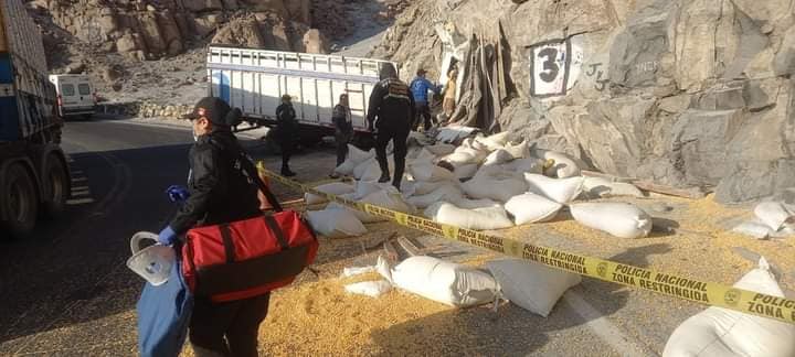 Los sacos de maíz que transportaba el camión Fuso Z4Q-378 quedaron al costado de la vía Arequipa-Uchumayo y la cabina principal de la unidad estaba destrozada, lo que demostraba la escena trágica de un fuerte impacto contra un cerro. La colisión dejó a Ubaldo Mena Ramos sin vida y a su copiloto Pilar N. gravemente herida.