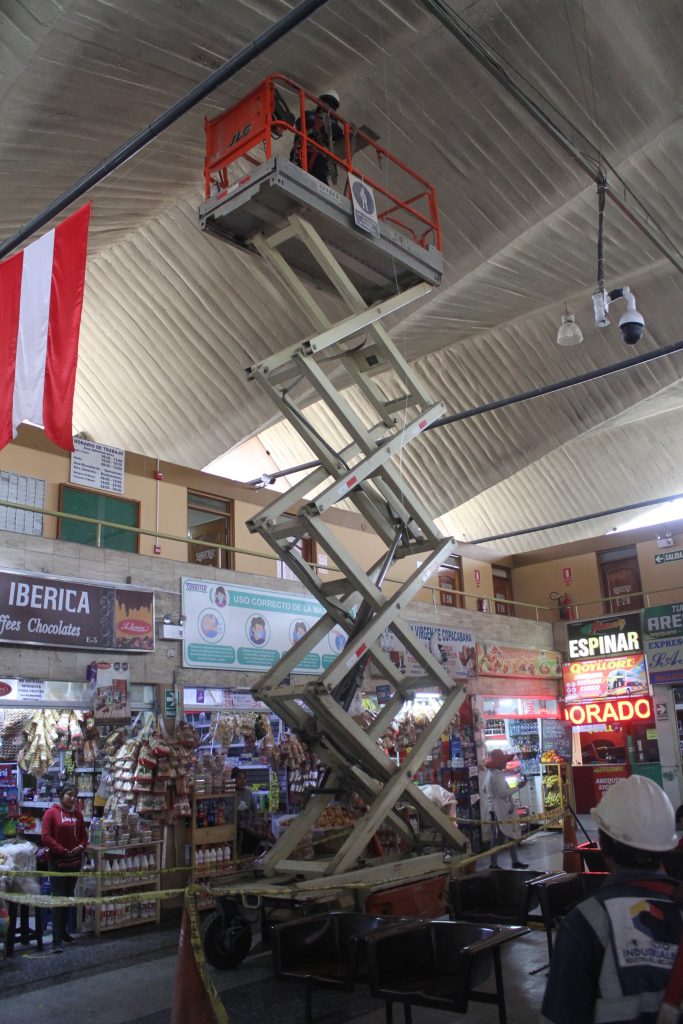 Reparaciones en lo alto. Lamentablemente el flujo de pasajeros en el terminal terrestre no ha sido el mejor en los últimos días. Sin embargo, aprovecharon para mejorar la iluminación, para este complicado trabajo se utiliza esta grúa porque el techo esta a mucha altura y no existe otra forma de acceder.
