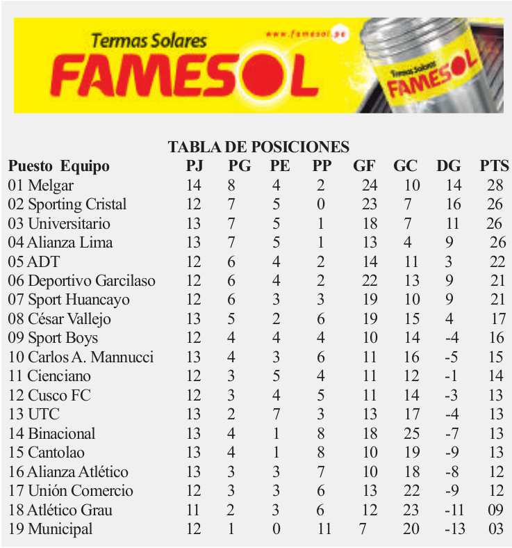 De otra parte, ayer Alianza Atlético de Sullana derrotó por 1-0 a Deportivo Binacional por la décima cuarta jornada del Torneo Clausura de la Liga 1 y se empieza a liberar del descenso. Ahora los juliaqueños tendrán un partido trascendental frente a Cantolao este sábado desde las 13:00 horas en el estadio Guillermo Briceño Rosamedina.