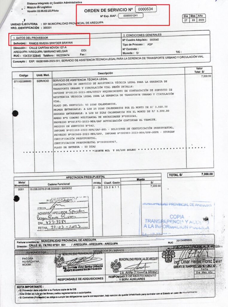 Spayder Brayan Ramos Rivera trabaja para la comuna provincial desde febrero de este año, por su labor se han girado órdenes de servicio, accedimos a 4. La primera está fechada el 17 de febrero, la conformidad del servicio la firmó el gerente del área, Omar Florez Salas y figura la cancelación de S/1800. La siguiente fue el 27 de marzo por el monto de S/7 mil, nuevamente la conformidad la dio Florez Salas. La siguiente corresponde al 5 de junio por 7 mil soles, no aparece la firma dando la conformidad. La última es del 24 de agosto por S/3500 sin conformidad.