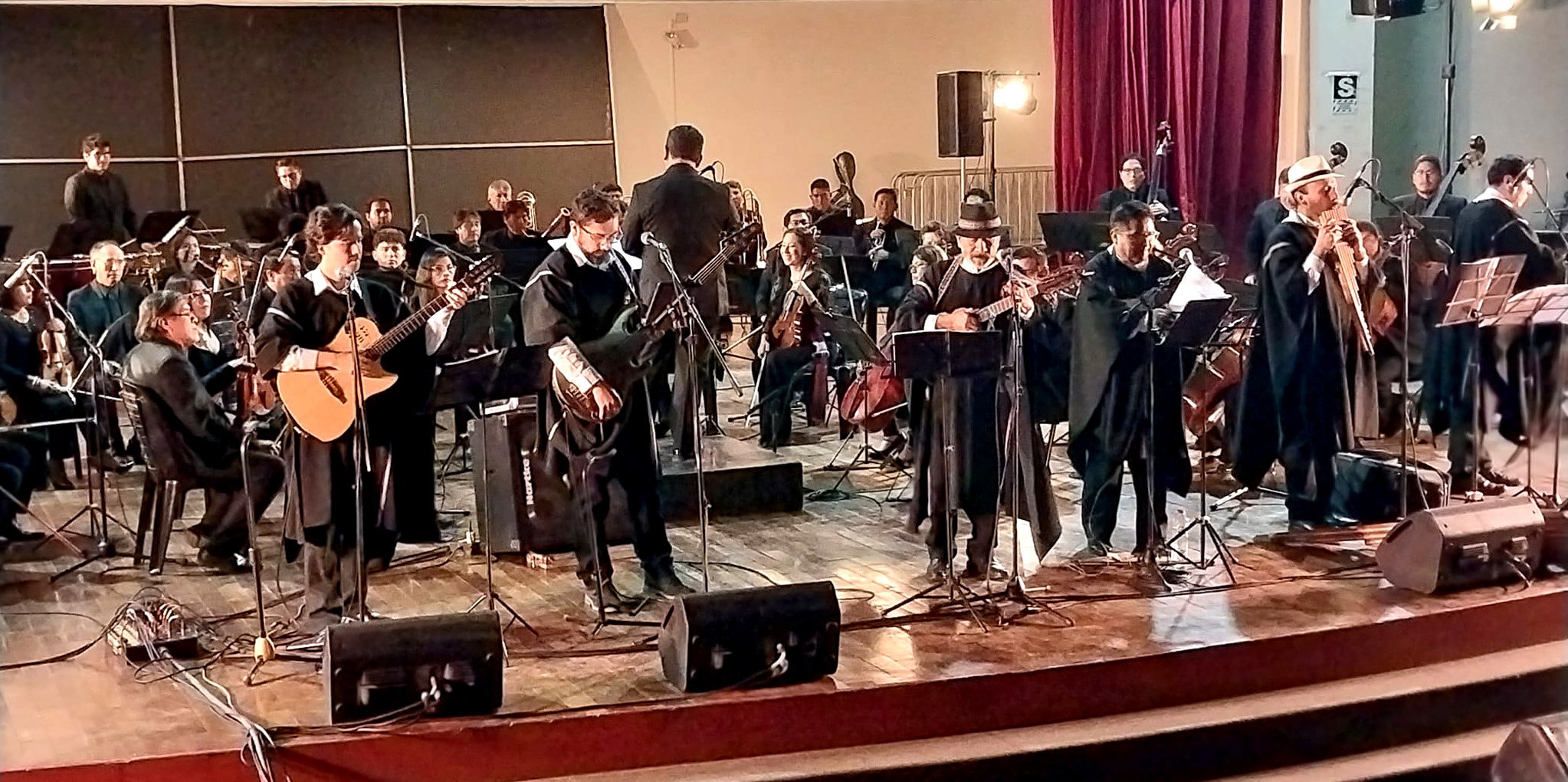 El pasado 15 de diciembre en el malogrado Auditorio del “Palacio” Vargas Llosa, Sayari Llaqta se unió a la Orquesta Sinfónica de Arequipa para ofrecer un programa de lo mejor de su autoría y algunas piezas arequipeñas y sudamericanas que evocaron su trayectoria a partir del proyecto original. Temas de Ariel Subia, miembro fundador, y de Jorge Lobón, el único del grupo original que continúa, fueron el núcleo del espectáculo. El inicio, una Obertura a cargo de la Orquesta Sinfónica de Arequipa dirigida por Enrique Victoria, con los sorprendentes arreglos de Andrés Aliaga fue de lo mejor de la noche, un fuerte estímulo para atender a lo que vino.