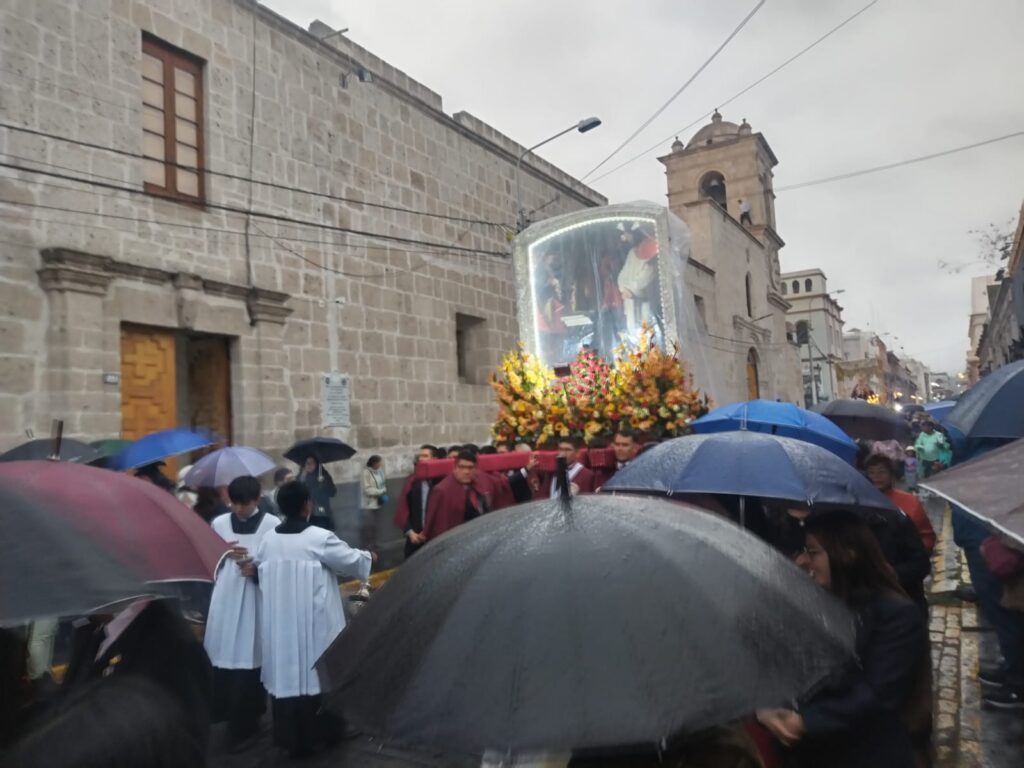 Después de llevar a cabo una oración a las imágenes referidas, la lluvia en el Cercado se intensificó. Esto motivó a que la hermandad colocara un plástico que envuelva la imagen para que después pase por las calles La Merced, Tristán, Álvarez Thomas y el Portal de Flores de la Plaza de Armas. El recorrido prosiguió por las vías San Francisco, Moral, Santa Catalina y el Portal de San Agustín. La procesión acabó con el retorno de la imagen a su iglesia de origen.