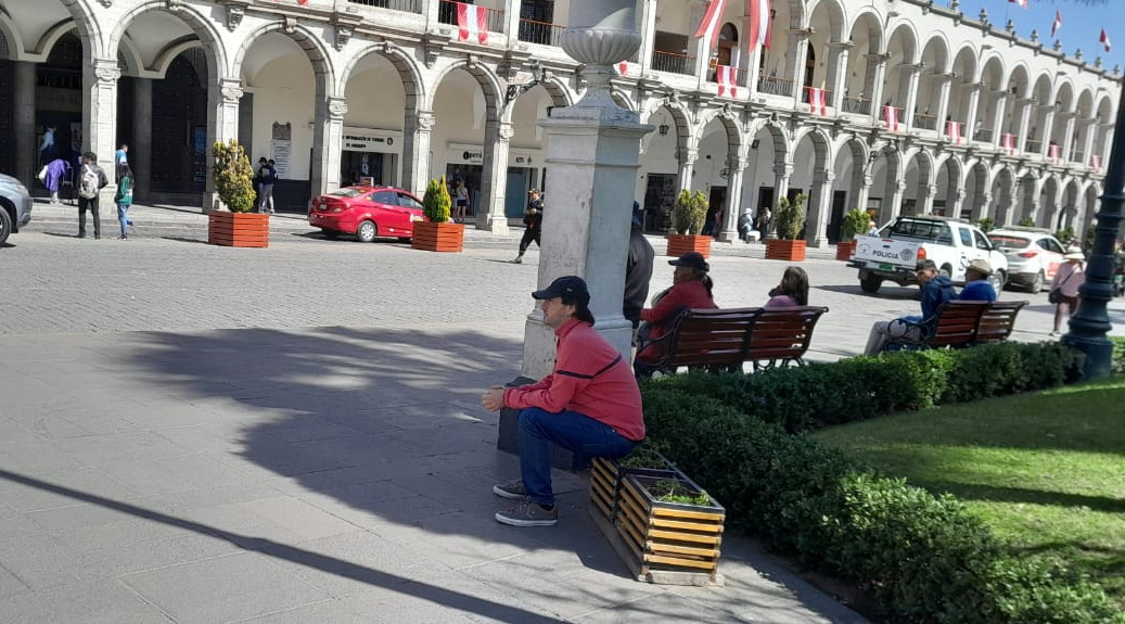 BANCA. Se ha incrementado la visista de turistas en la Plaza de Armas, y algunos buscan donde sentarse, como este turista que no encontro mejor banca que una de las macetas pequeñas que han colocado en una de las esquinas.