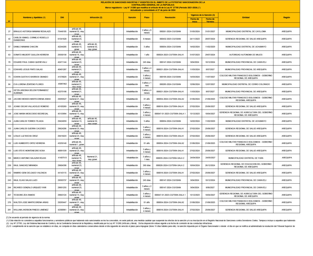 La relación de servidores castigados inicia con Braulio Astorga Mamani Resalazo, quien prestaba servicio en la Municipalidad Distrital de Caylloma, él ha sido inhabilitado por el plazo de 2 años 8 meses, tiempo que ha empezado a correr desde el 31 de mayo de este año y culminará el 31 de enero de 2027.