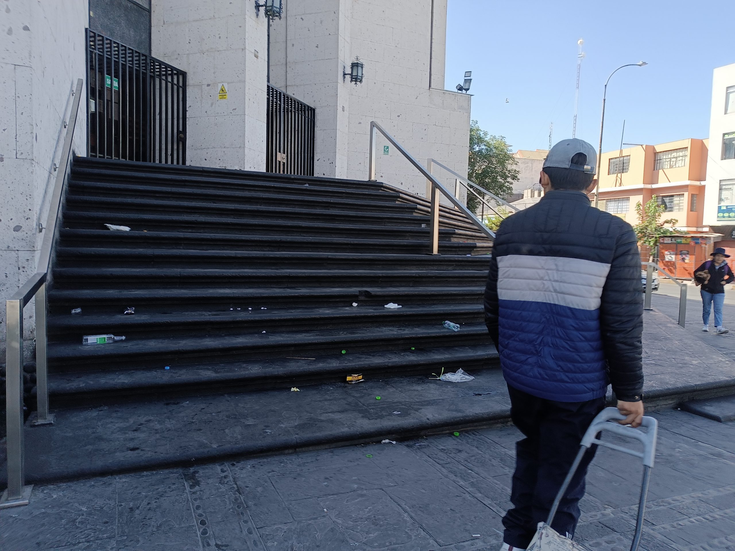PESTILENCIA. El ingreso al Poder Judicial en Arequipa amaneció cubierto de basura, botellas vacías de bebidas y un fuerte olor a orina. Este escenario de suciedad y descuido se presentó en los alrededores de la Plaza España donde varios grupos se dan cita para practicar danzas.