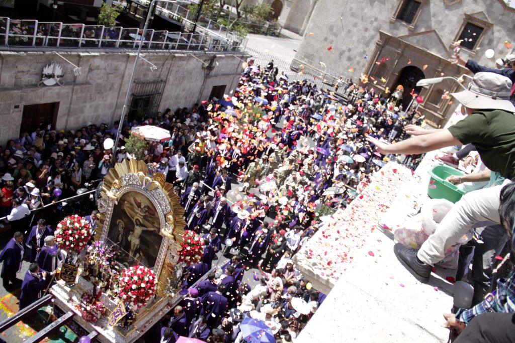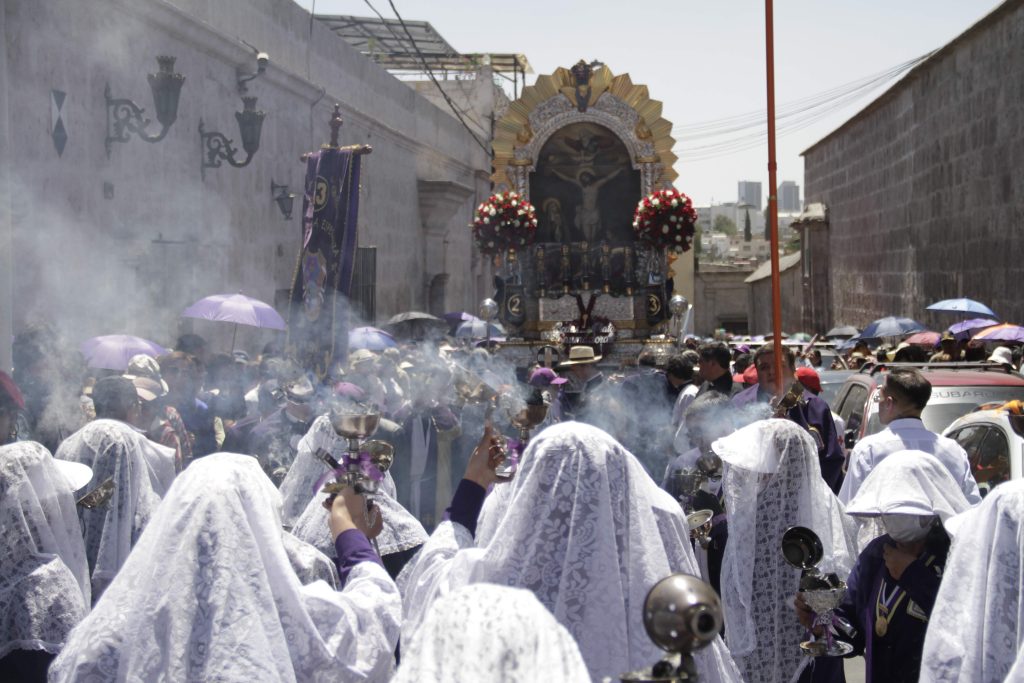 “Señor de los Milagros, a Ti venimos en procesión tus fieles devotos a implorar tu bendición…” se escuchaba, mientras avanzaba la imagen en hombros de los llamados “cargadores” por las calles del centro de la ciudad, sin importar el intenso calor que soportó ayer Arequipa.