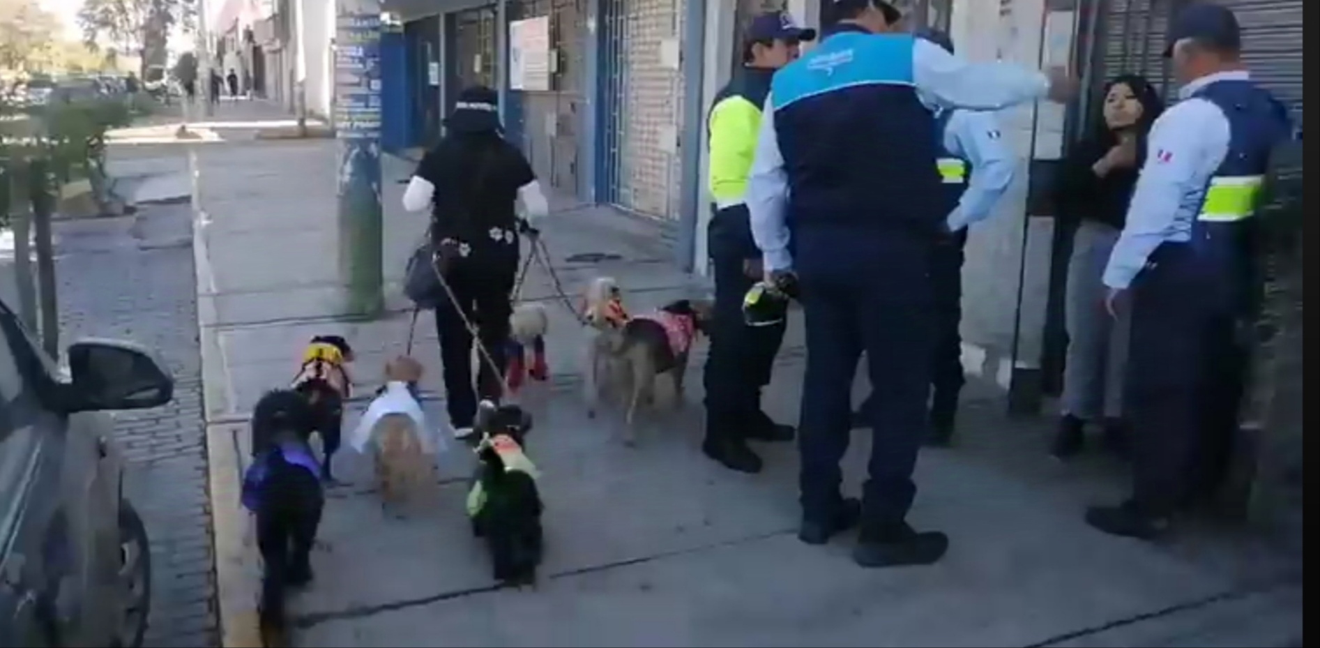 PASEO. Mientras los agentes del serenazgo de José Luis Bustamante y Rivero continuaban retirando a jóvenes de la Av. Dolores, una ciudadana que paseaba junto a sus perros disfrazados robó miradas entre los presentes. Con coloridos atuendos que llamaban la atención de transeúntes y vecinos, los simpáticos perritos ofrecieron una escena pintoresca en medio de una jornada de control y orden público.