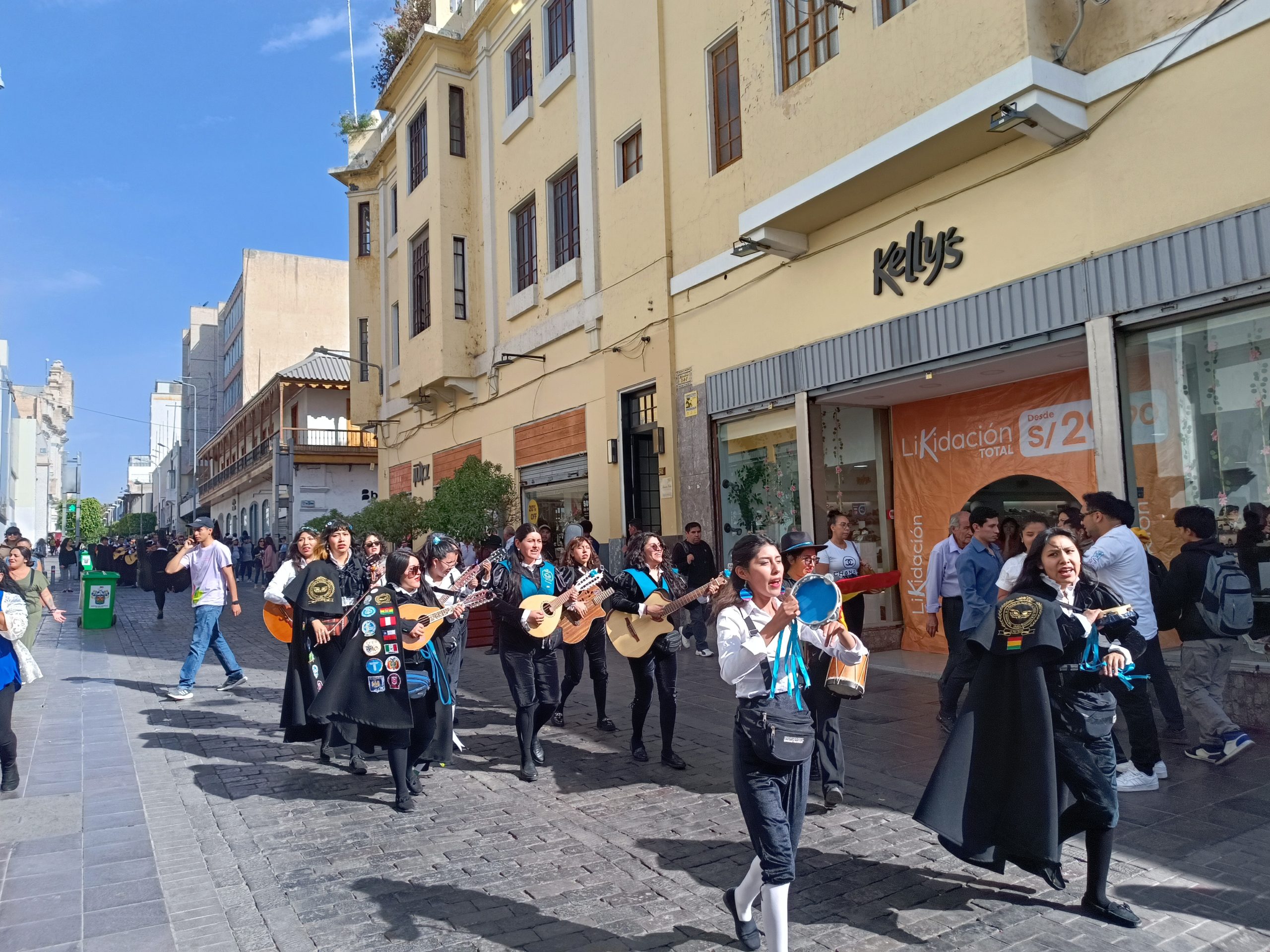 TUNOS. Diversas agrupaciones de tunos sorprendieron a turistas y locales al recorrer la emblemática calle Mercaderes en Arequipa, inundando el Centro Histórico con su música y alegría. Ataviados con sus tradicionales capas y laúdes, los músicos improvisaron un espectáculo que cautivó a quienes paseaban por el lugar.