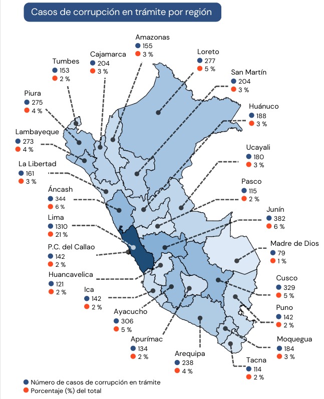 A nivel nacional, se identificaron 6,152 casos de corrupción en trámite en el segundo semestre de 2024, el 95% de ellos está en investigación preliminar, el 4% en investigación preparatoria, el 0.2% en etapa intermedia y solo el 0.3% está en juicio oral o juzgamiento.