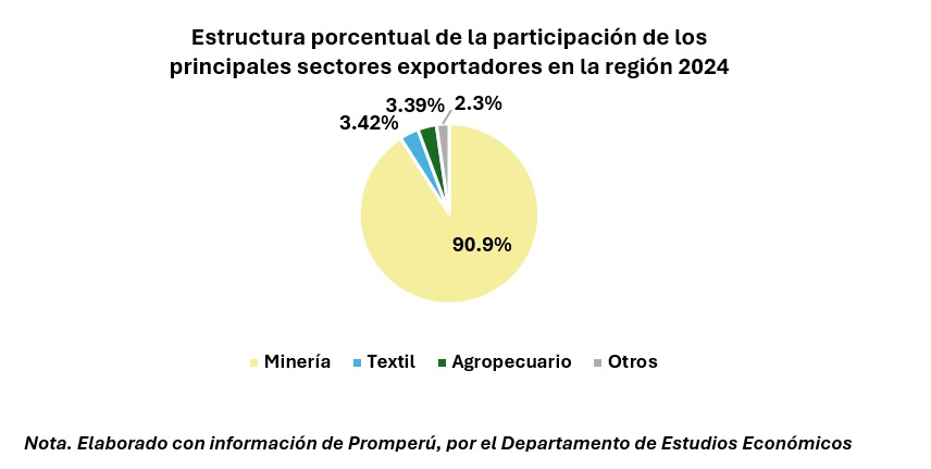 Por otro lado, dentro de los sectores exportadores de Arequipa, el sector minero se mantiene como el de mayor participación en 2024, concentrando el 90.9% de las exportaciones regionales, con el cobre, el molibdeno y el plomo como sus principales productos.