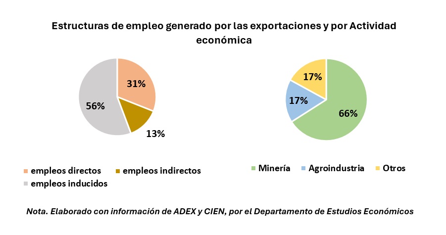 Asimismo, en la generación de empleo por exportaciones, las principales actividades económicas que contribuyeron durante este período fueron la minería, con una participación del 66%; la agroindustria, con el 17%; y otros sectores, con el 17% restante. Estos resultados resaltan la importancia de estos sectores en la dinamización económica y contribuyen al crecimiento y desarrollo de la región.
