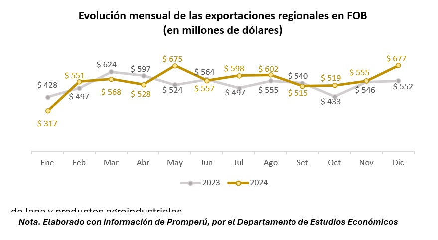 Las exportaciones regionales han mostrado una evolución variable a lo largo del año, reflejando tanto los efectos de la demanda internacional como el desempeño de los sectores productivos más relevantes. Al cierre de 2024, las exportaciones alcanzaron un total de 6,662 millones de dólares, superando en un 4.8% a 2023.