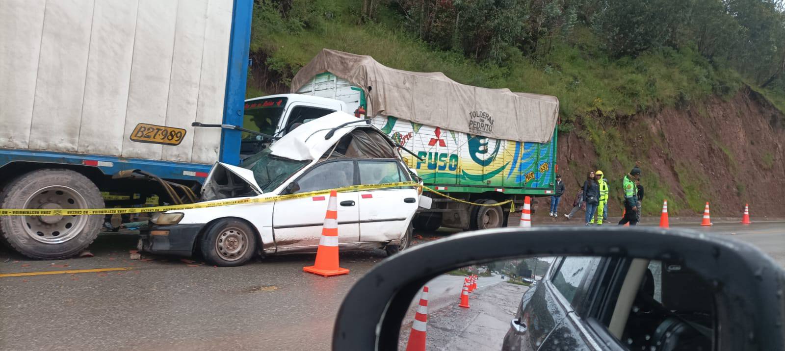 En el vehículo, que quedó en medio de los dos tráileres resultó más perjudicado, viajaba una familia. La víctima mortal fue identificada como Aurelia Pinto, mientras que su esposo y su hijo quedaron heridos y fueron trasladados a un establecimiento de salud.