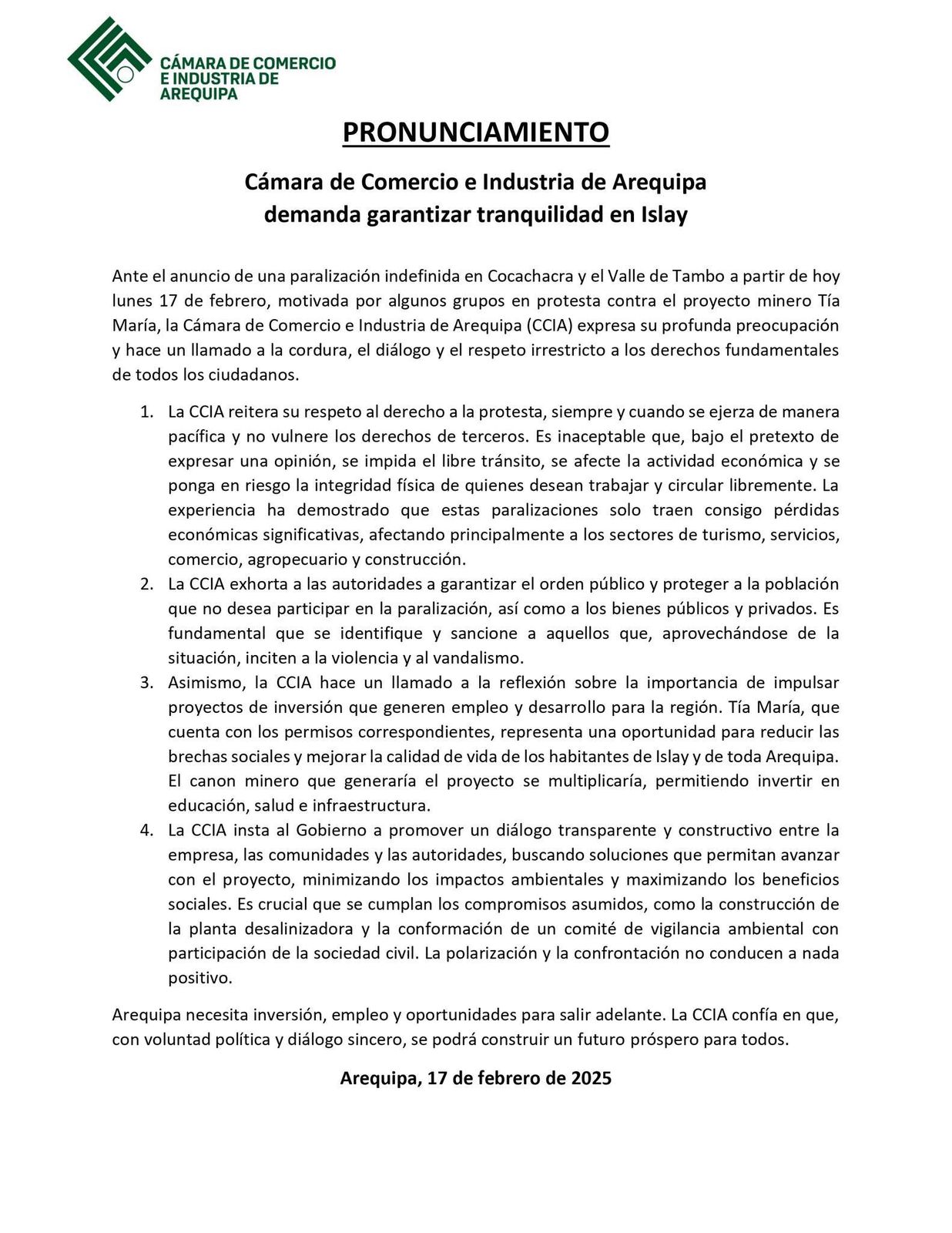 La Cámara de Comercio de Arequipa se pronuncia ante las propuestas de la población de Cocachacra contra el proyecto minero Tía María. Lee la carta completa. 📜⚖️ #Arequipa #TíaMaría #CámaraDeComercio