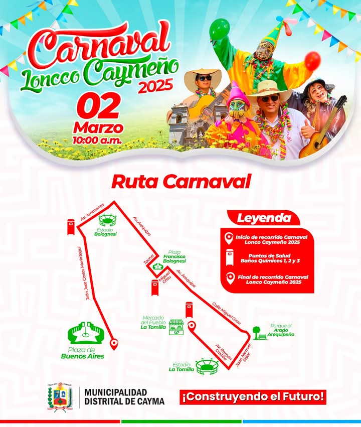 Según Candy Luna, en el Carnaval Loncco Caymeño participarán las comparsas de Acequia Alta, La Tomilla, Carmen Alto, Chilina, Francisco Bolognesi, Villa El Mirador, Buenos Aires, Upis Dean Valdivia, 11 de Mayo y la Asociación de La Tomilla.
