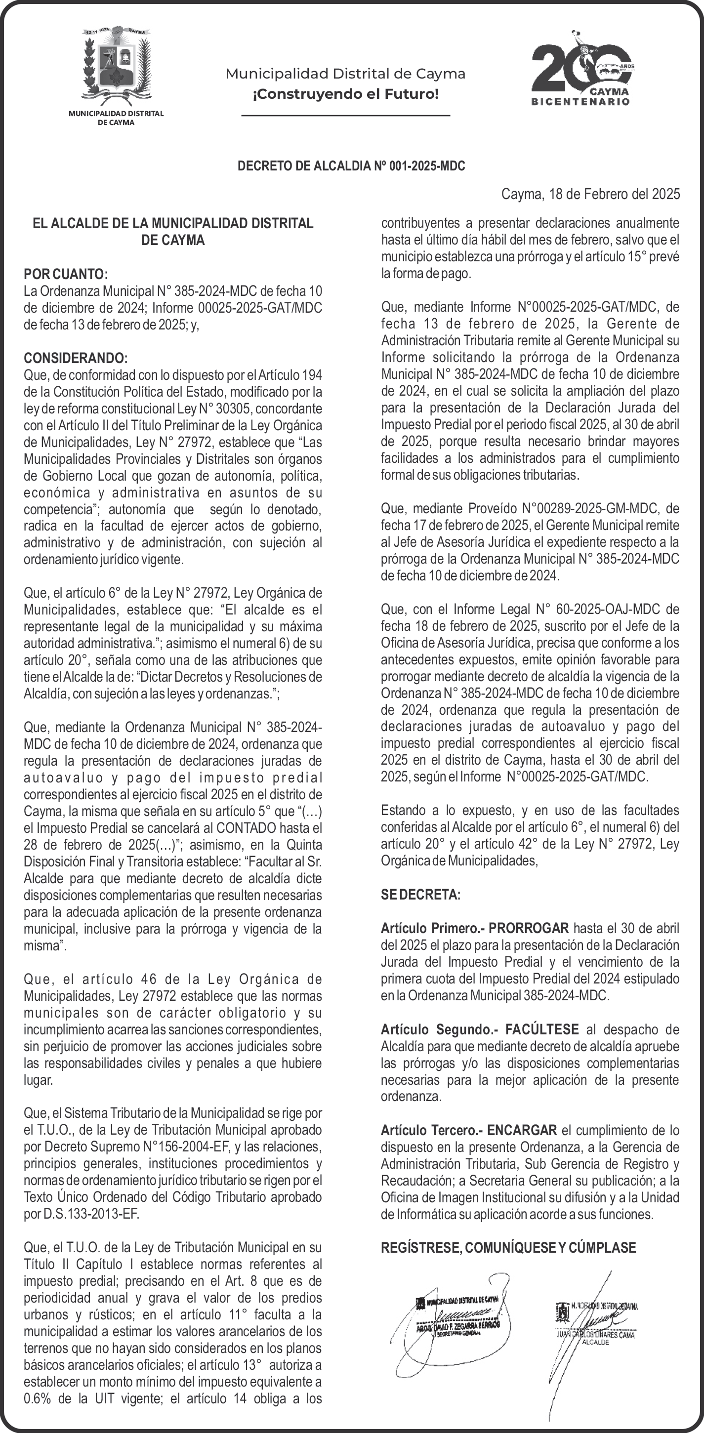 DECRETO DE ALCALDIA N°001-2025-MDC 28 de febrero de 202528 de febrero de 2025 DECRETOS Post Views: 58