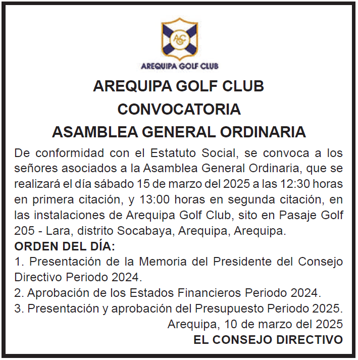 CONVOCATORIA GOLF ASAMBLEA ORDINARIA 10 de marzo de 202510 de marzo de 2025 CONVOCATORIAS Post Views: 52