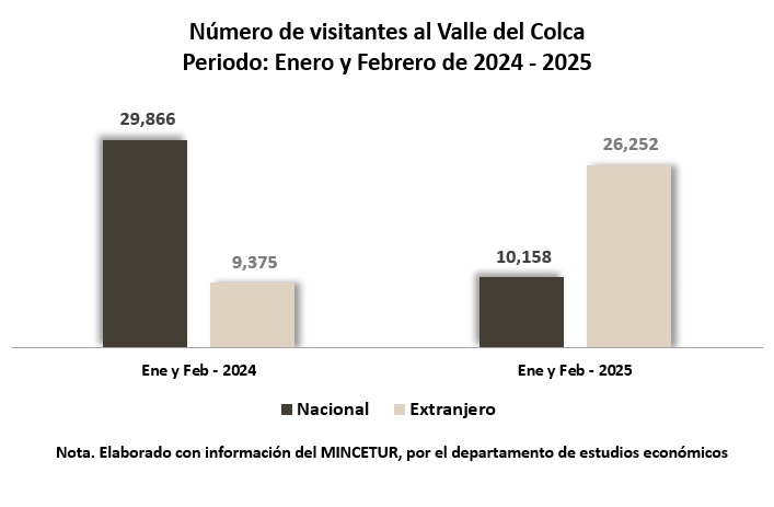 Asimismo, con respecto al Valle de Colca, este centro turístico registró una dinámica opuesta con respecto al Monasterio de Santa Catalina. Durante enero y febrero de 2025, este destino turístico recibió un total de 36 410 visitantes, lo que representa una disminución de 7.2 % con respecto al mismo bimestre de 2024, en el cual se registraron 39 241 ingresos.