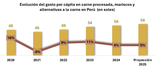 Para 2025 se estima que el gasto por persona llegue a los 59 soles, con un crecimiento de 5 %. Se prevé que esta proyección esté influenciada por el fortalecimiento de tendencias alimentarias más saludables y al impulso del sector gastronómico. Además, el interés por alternativas a la carne tradicional continúa en crecimiento por lo que contribuirá a la estimación de 2025.