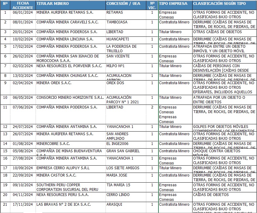 Los accidentes laborales son recurrentes en el sector minero. Según la memoria anual 2024 de la compañía Cerro Verde, ese año se reportaron 107 accidentes, entre leves y fuertes. En 39 de ellos estuvieron involucrados trabajadores directos de la minera y en el resto, empleados contratados.