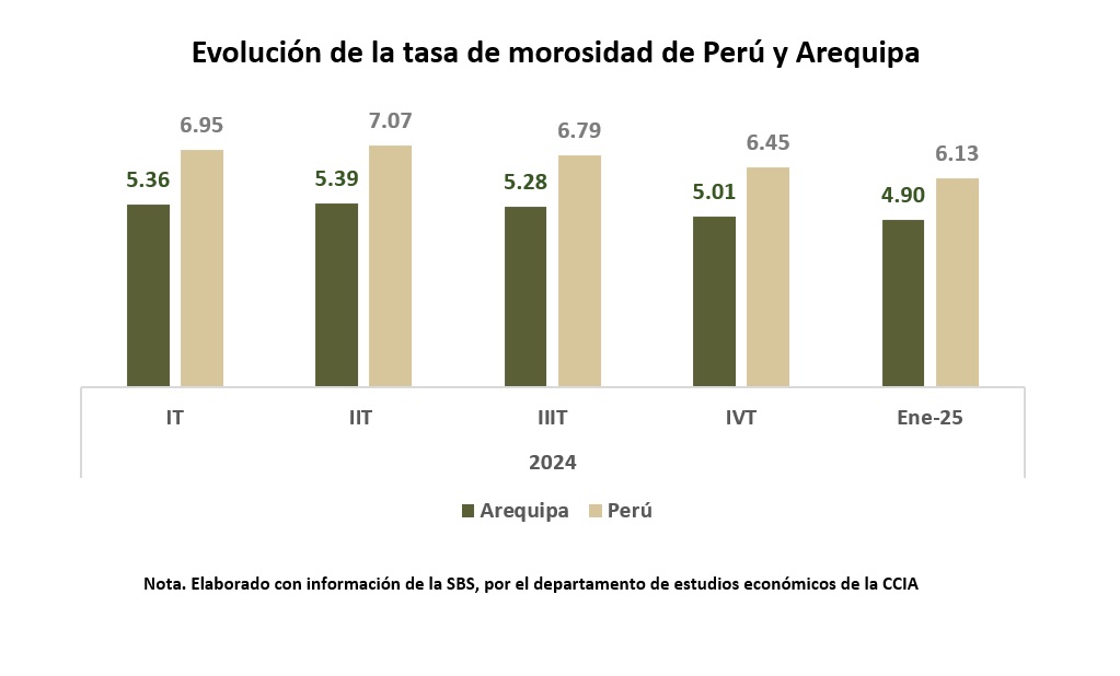 Esta diferencia se acentuó en enero de 2025, mes en el cual Arequipa registró una tasa de morosidad de 4.90 %, muy por debajo del promedio nacional de 6.13 %.
