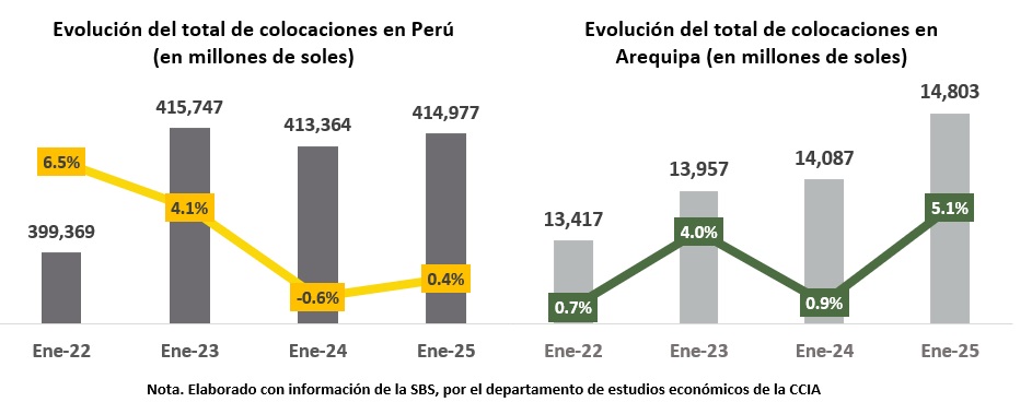 Al cierre de enero de 2025, las colocaciones en Arequipa experimentaron un crecimiento de 5.1 % en comparación con el mismo mes de 2024. Este desempeño representó una aceleración significativa respecto al ligero aumento de 0.9 % registrado en enero de 2024.