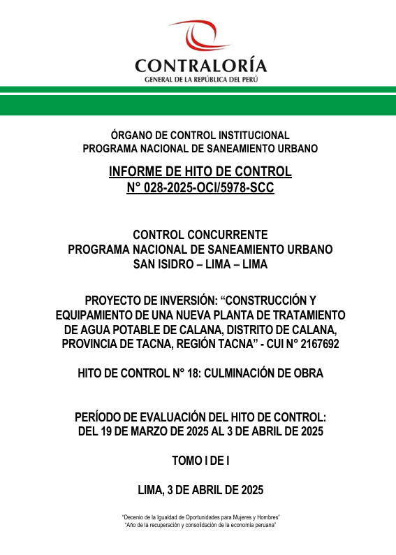 En el Informe de Hito de Control n.°028-2025-OCI/5978-SCC, se detalla que la obra denominada “Construcción y equipamiento de una nueva planta de tratamiento de agua potable” fue recibida y se encuentra en etapa de puesta en marcha, por lo cual la entidad fiscalizadora superior también advierte que podrían permitirse pagos que no corresponden por los trabajos mal ejecutados.