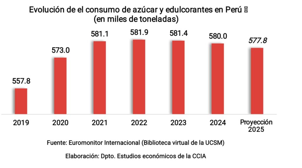 Según Euromonitor Internacional, en el año 2024, el consumo de azúcar y edulcorantes alcanzó un total de 580 mil toneladas en Perú, lo que representa una leve reducción de 1.4 mil toneladas frente al año previo (581.4 mil toneladas en 2023).