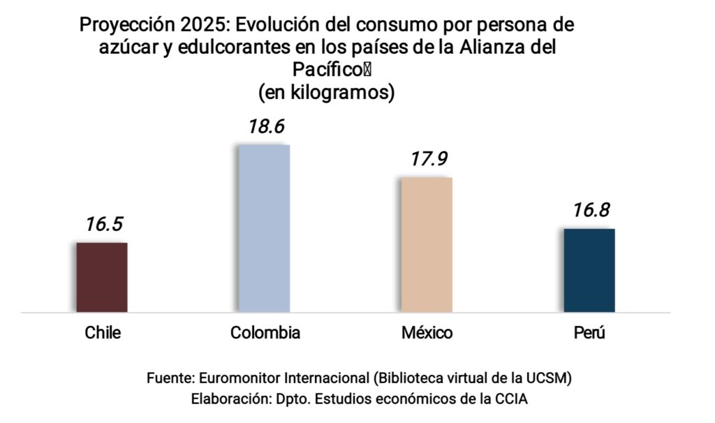 Para el año 2025, se proyecta que el consumo por persona de azúcar y edulcorantes en Perú será de 16.8 kilogramos, manteniéndose en una tendencia descendente observada en los últimos años. Esta proyección se relaciona al cambio sostenido en los hábitos de consumo, impulsado por una mayor conciencia sobre los efectos del consumo excesivo de azúcar en la salud, además, el fortalecimiento de políticas públicas orientadas a desincentivar su uso; como el etiquetado de advertencia en alimentos procesados y una oferta cada vez más amplia de productos bajos en azúcar o con edulcorantes alternativos, modificarán las preferencias de los consumidores.