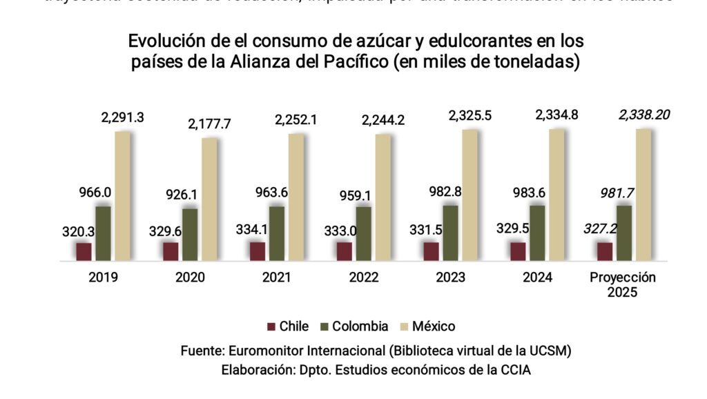 Por otro lado, con respecto al consumo de azúcar y edulcorantes en los países de la Alianza del Pacífico; México, con 2 334.8 mil toneladas, mantuvo su posición como el mayor consumidor; reflejando una estabilidad en la demanda respecto a 2023 (2 325.5 mil toneladas). Este comportamiento se explica por el tamaño de su población, el peso de su industria alimentaria y una cultura de consumo en la que el azúcar sigue teniendo un rol relevante, a pesar de las políticas de salud pública implementadas en años anteriores.