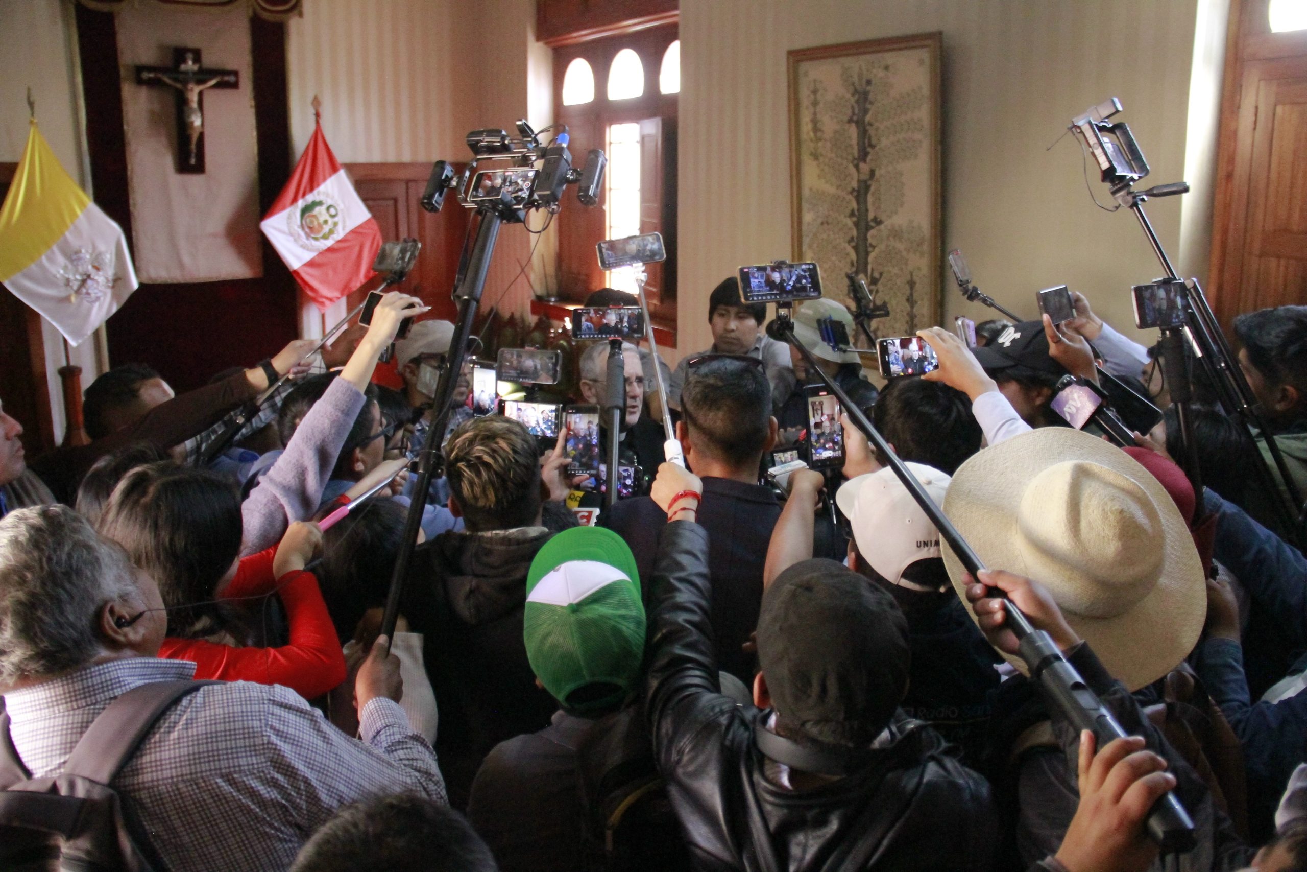 DESAPARECIÓ. La mañana de ayer se eligió al papa después de 2 días de estar reunidos los cardenales en el Vaticano, y, en nuestra Ciudad Blanca, monseñor Javier del Río Alba convocó a rueda de prensa en el Arzobispado de Arequipa para hablar sobre el tema. A la hora de entrevistarlo aparecieron casi todos los periodistas de la ciudad, por no decir todos, que rodearon a la autoridad Eclesiástica, quien desapareció en medio de los celulares y cámaras.