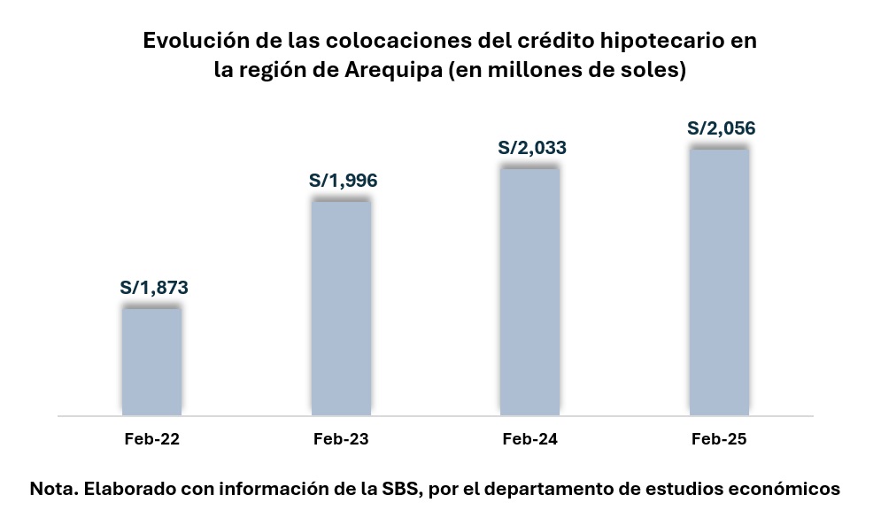 En ese sentido, con respecto al crédito hipotecario, éste mantuvo un crecimiento continuo hasta febrero durante los últimos cuatro años; alcanzando en 2025 un monto de S/ 2 055 millones. Esta cifra supera en S/ 22 millones el valor registrado en febrero de 2024, lo que equivale a un incremento interanual de 1.1 %. Esta evolución favorable refleja una demanda constante de financiamiento para la adquisición de vivienda en la región, y se espera que esta tendencia continúe en los próximos meses del año.