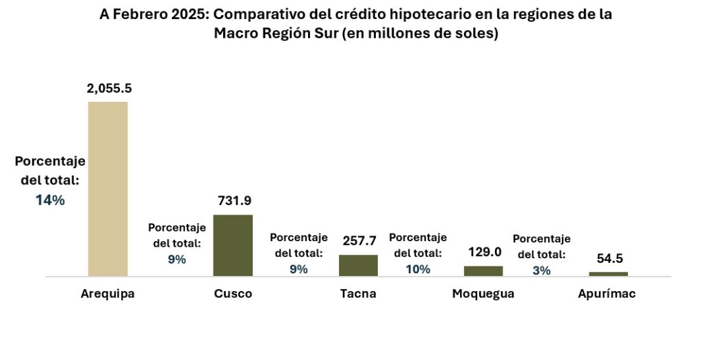 La fortaleza del crédito hipotecario en Arequipa se destaca con claridad al compararlo con las demás regiones de la Macro Región Sur. En febrero de 2025, Arequipa concentró un total de 2 mil 55 millones de soles en las colocaciones de crédito hipotecario, cifra que supera por casi tres veces a la registrada por Cusco.