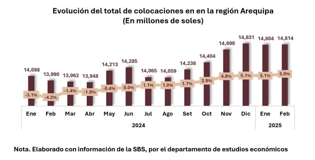 Al 28 de febrero de 2025, el monto total de colocaciones en Arequipa alcanzó los 14 mil 814 millones de soles, lo que representa un crecimiento de 5.9 % respecto al mismo mes de 2024. Este comportamiento se explica, en parte, por un aumento en la participación del crédito dirigido a pequeñas empresas, que concentraron cerca del 40 % del total, mientras que los créditos de consumo representaron un 20 %, y los hipotecarios, un 14 %.