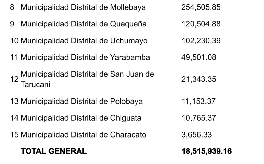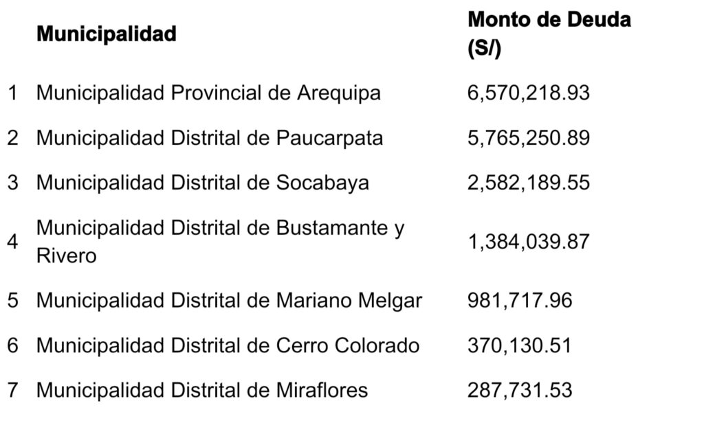 En total, son más de S/ 18 millones 525 mil los que adeudan 15 gobiernos locales por el servicio de agua potable y alcantarillado que brinda la empresa.La Municipalidad Provincial de Arequipa encabeza la lista con una deuda de S/ 6 millones 570 mil. Le siguen Paucarpata con S/ 5 millones 765 mil, y Socabaya, que debe S/ 2 millones 582 mil. También figuran municipalidades como Bustamante y Rivero, Mariano Melgar, Cerro Colorado y otras que, si bien con montos menores, han acumulado saldos significativos.