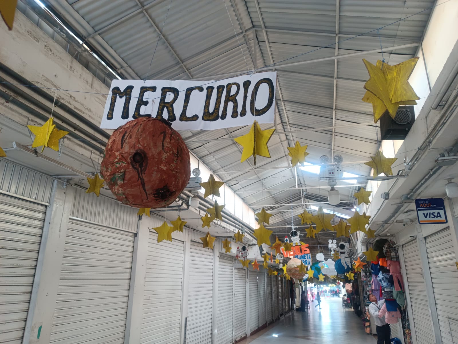 Pasaje de planetas. En uno de los centros comerciales de la plataforma Andrés Avelino se colocaron maquetas de los planetas del sistema solar que llaman la atención de los compradores.