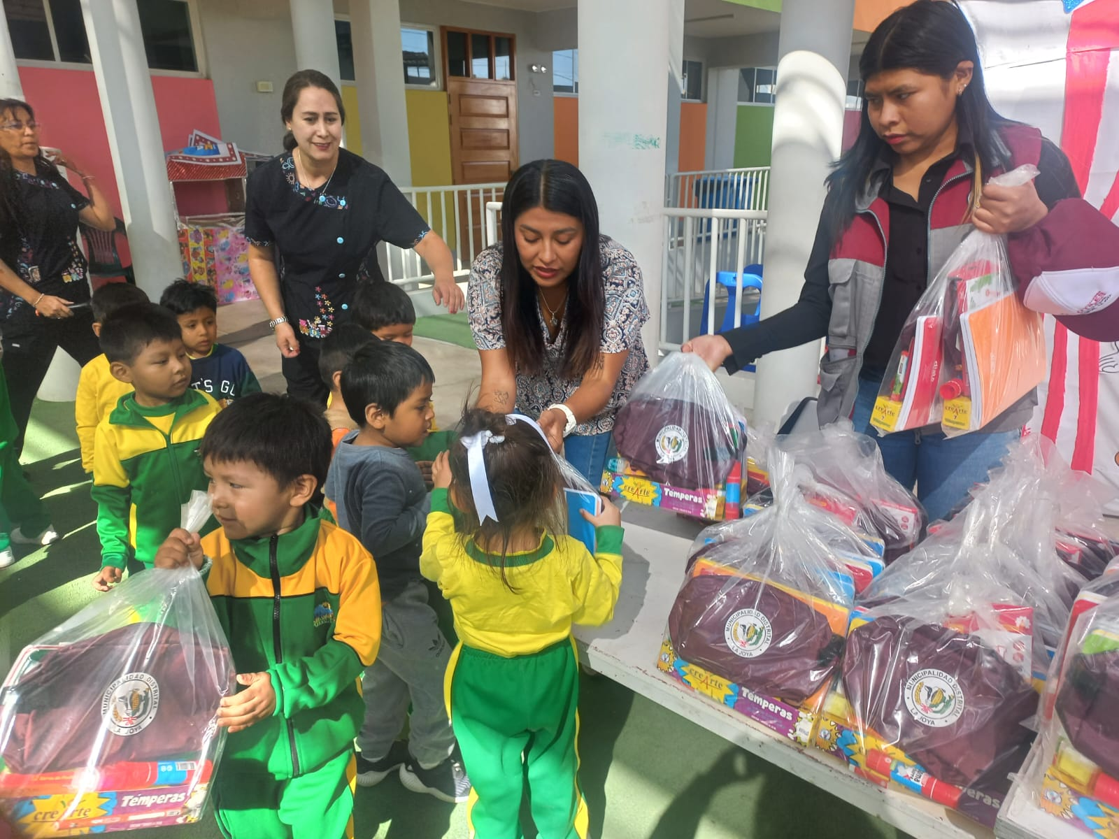 Materiales escolares para los tres niveles de educación. La Municipalidad Distrital de La Joya culminó la entrega de kits escolares a todos los niños del nivel inicial, primaria y secundaria de todos los colegios públicos de la jurisdicción, con el objetivo de mejorar el nivel educativo, la equidad educativa y el acceso a materiales esenciales para el aprendizaje.