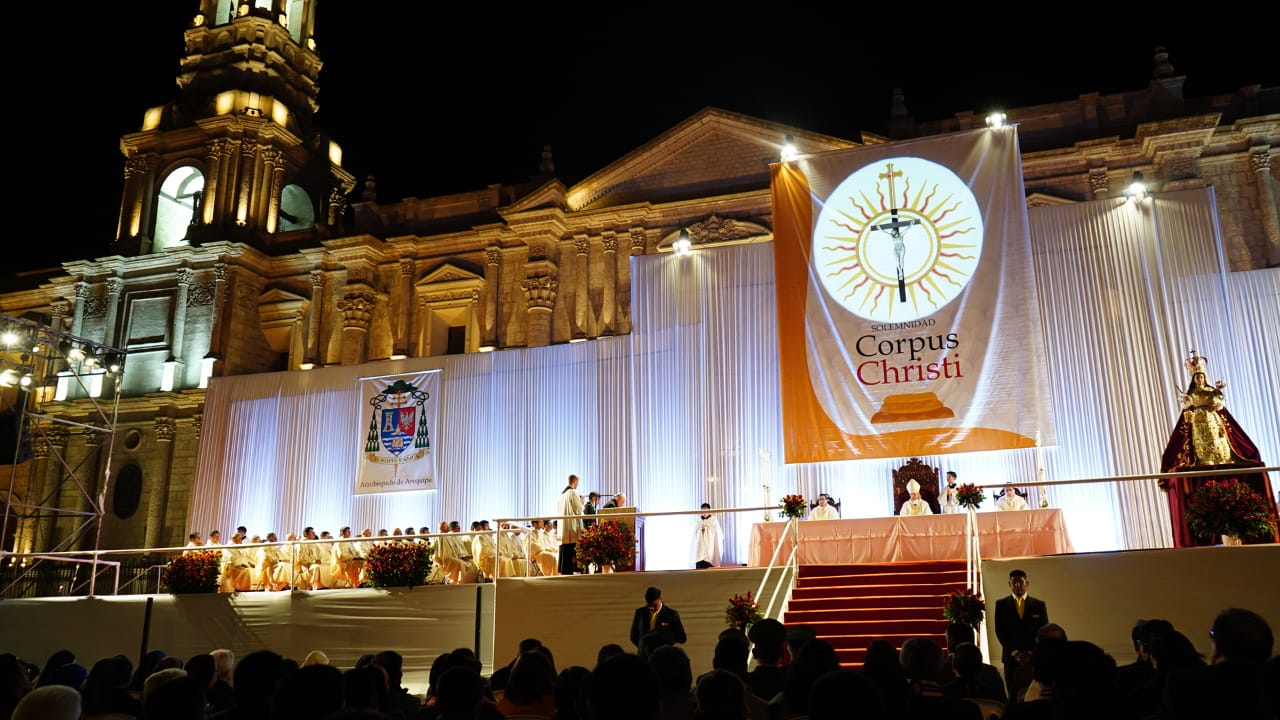 La Iglesia en Arequipa vivió con profunda devoción la solemnidad del Cuerpo y la Sangre de Cristo el jueves 19 de junio, cuando miles de fieles se congregaron en el atrio de la Basílica Catedral para participar en la misa celebrada a las 6 p. m., que culminó con la tradicional procesión por el perímetro de la Plaza de Armas. La celebración contó con la participación de autoridades civiles, políticas y militares de la región, así como todo el clero de la Arquidiócesis, seminaristas y comunidades de vida consagrada.