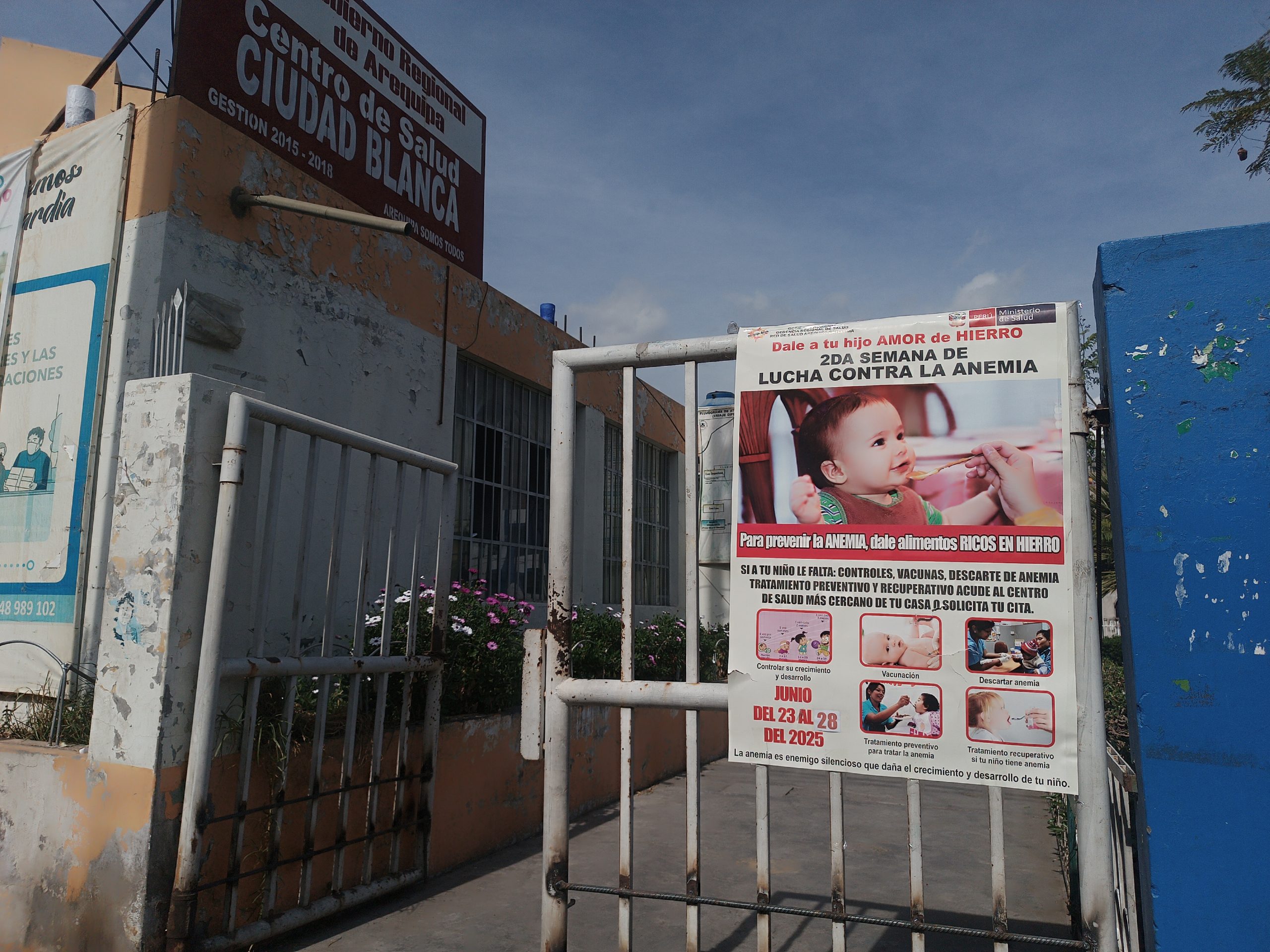 Un cartel ubicado en la puerta de ingreso del centro de salud de Ciudad Blanca recuerda a los padres y madres de familia estar atentos a los controles médicos de sus hijos, ello en el marco de la segunda semana de lucha contra la anemia.