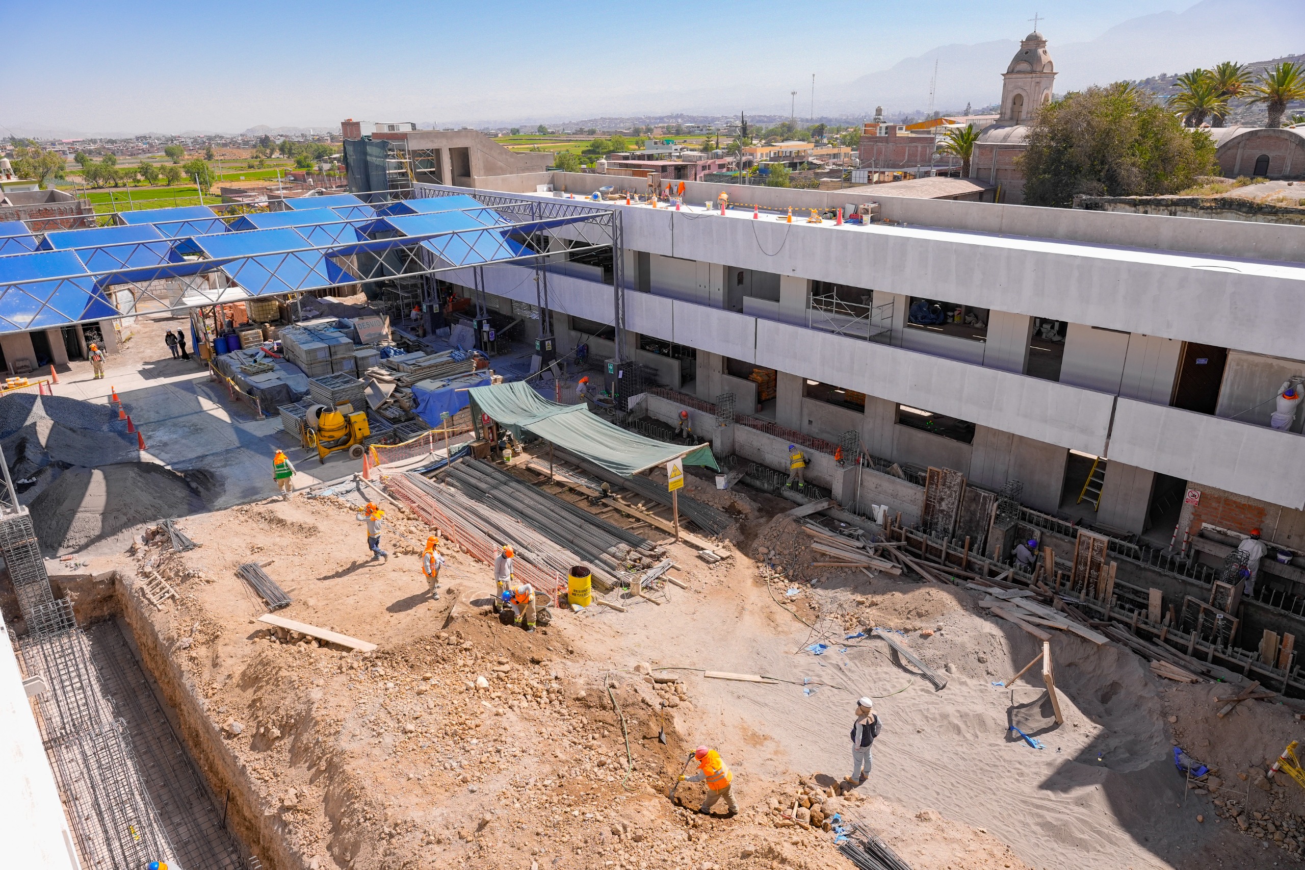 El Gobierno Regional de Arequipa avanza en la construcción de la nueva infraestructura de la I.E. San Juan Bautista en Characato, con un avance del 60 %, obra que beneficiará a más de 600 niños y niñas de nivel primario con ambientes modernos, seguros y totalmente equipados.
