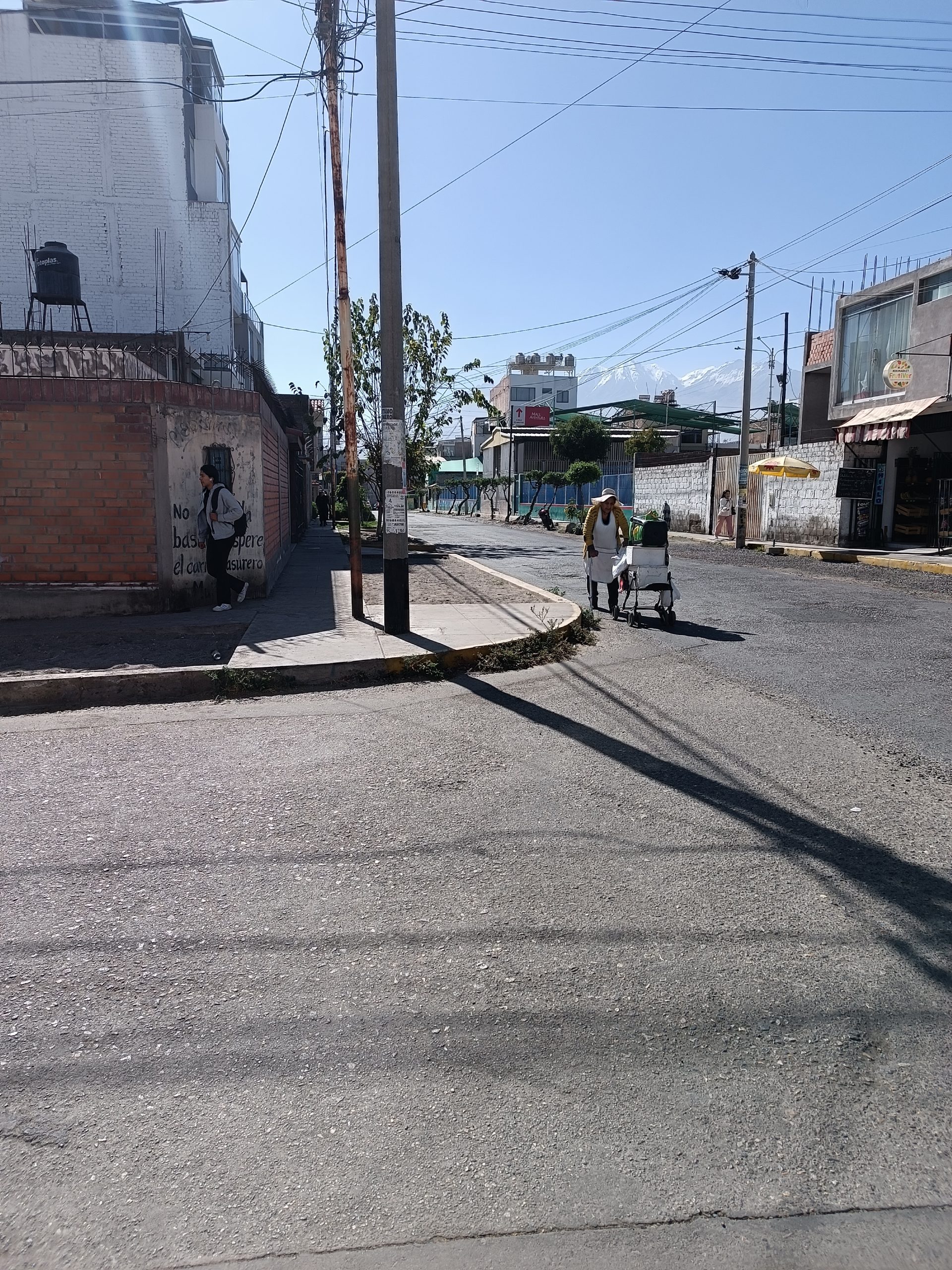La falta de rampas en las esquinas de las veredas obliga a una mujer con discapacidad llevar su herramienta de trabajo por la misma vía. Esta infraestructura tampoco es inclusiva para las personas que usan silla de ruedas.