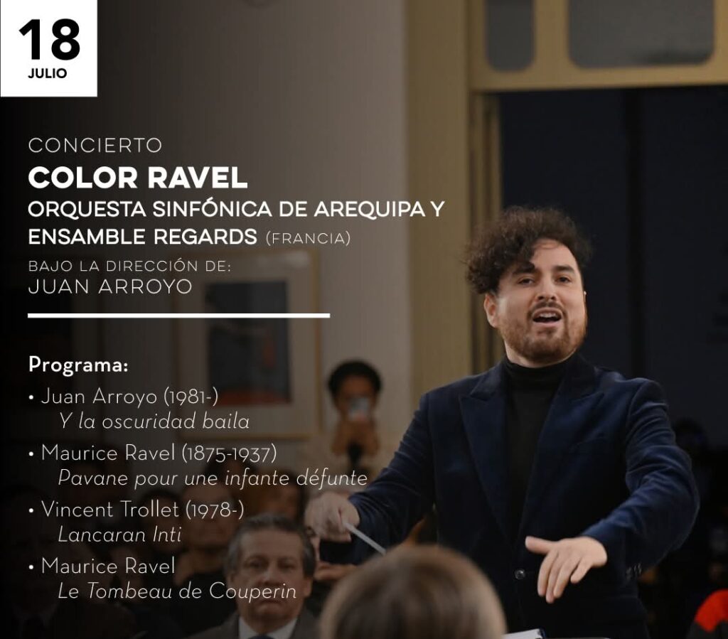 Finalmente, el jueves 18 de julio a las 7:00 p. m., se llevará a cabo el concierto “Color Ravel”, a cargo de la Orquesta Sinfónica de Arequipa y el Ensamble Regards de Francia, bajo la dirección del maestro Juan Arroyo. El repertorio incluirá obras de Maurice Ravel, Juan Arroyo y Vincent Trollet. La presentación será en el Templo de la Tercera Orden Franciscana (calle Puente Grau 138), con ingreso libre.