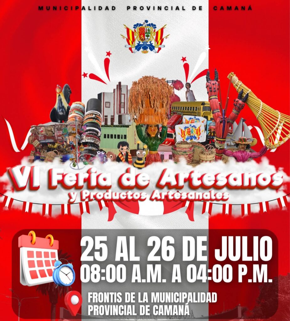 Camaná se prepara para celebrar las Fiestas Patrias a través de la VI Feria de Artesanos y Productos Artesanales, que busca revalorar el trabajo de los creadores camanejos. La actividad se desarrollará este viernes 25 y sábado 26 de julio, desde las 8:00 a.m. hasta las 4:00 p.m., en el frontis de la Municipalidad Provincial.