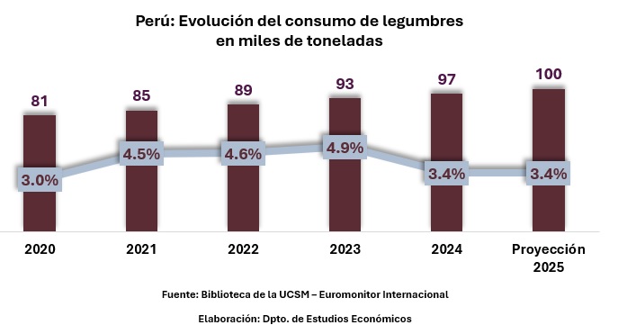 Para el 2025 se proyecta un consumo de 100 mil toneladas, con un incremento estimado de 3.4%. Este crecimiento sostenido ha estado influenciado por diversas campañas de promoción impulsadas desde el sector público y privado, que resaltan el valor de las legumbres como una fuente económica y saludable de proteína vegetal. Además, su aporte en la lucha contra la anemia y la seguridad alimentaria ha contribuido a que estos productos ganen mayor presencia en la mesa de los hogares peruanos.