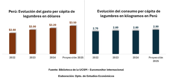 Este mayor interés por las legumbres también se refleja en el consumo por persona y en el gasto que los hogares destinan a este grupo de alimentos. En 2024, el consumo per cápita se ubicó en 2.8 kilogramos, mientras que el gasto promedio alcanzó los 3.20 dólares, mostrando una tendencia creciente que se mantendría en 2025 en el que se proyecta un consumo de 2.9 kg por persona y un gasto de 3.50 dólares.