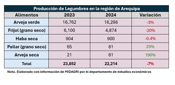 En 2024, la región de Arequipa registró una producción total de 22 214 toneladas de legumbres, lo que significó una disminución de 7 % respecto al año anterior; ello debido al retroceso en cultivos como el frijol, cuya producción bajó en 20 %, y la arveja verde, que tuvo una reducción de 3 %. También se reportó una leve caída en el volumen de haba seca, uno de los productos tradicionales del valle arequipeño.