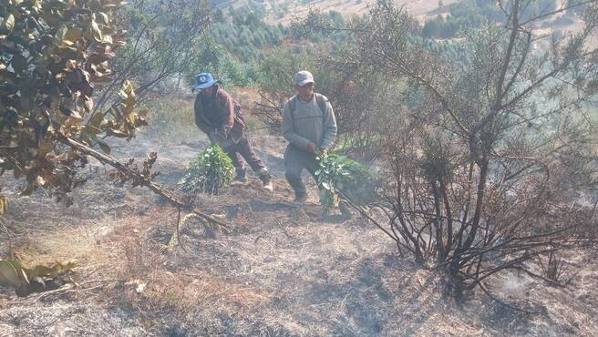 Brigadas comunales y personal de la Oficina de Gestión del Riesgo de Desastres y Seguridad (OGRDS), serenazgo, trabajaron en conjunto para mantener el control, evitar el avance y finalmente liquidar el siniestro que comenzó en el sector de Anyaraca Coracay.