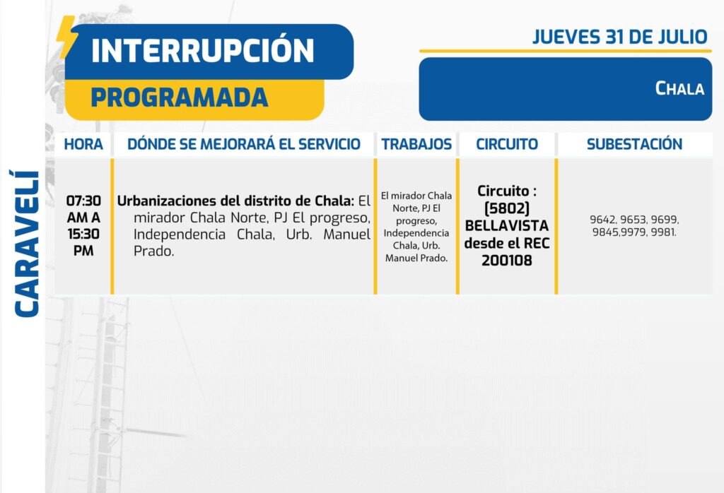 En Chala (Caravelí), el corte será de 7:30 a. m. a 3:30 p. m. y abarcará El Mirador Chala Norte, PJ El Progreso, Independencia Chala y la Urb. Manuel Prado. Se trata de trabajos en infraestructura eléctrica dentro del Circuito Bellavista (5802) desde el REC 200108, que afectará las subestaciones 9642, 9653, 9699, 9845, 9979 y 9981.Para saber si serás afectado por la interrupción, revisa tu recibo de luz y ubica el número de tu subestación (SE). Si coincide con alguno de los códigos mencionados, toma precauciones para evitar inconvenientes durante las horas sin servicio.