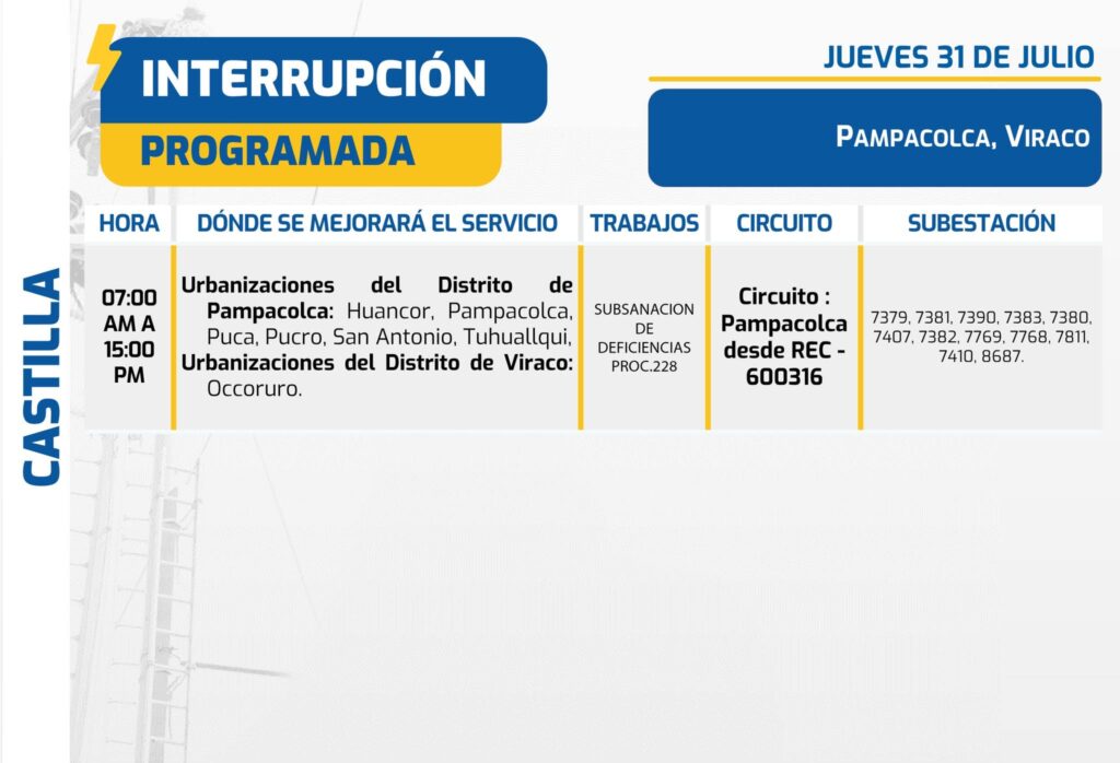 En Pampacolca y Viraco (Castilla), la interrupción será en el mismo horario, de 7:00 a. m. a 3:00 p. m., e incluirá Huancor, Pampacolca, Puca, Pucro, San Antonio, Tuhuaillqui y Occoruro. Este corte obedece a la subsanación de deficiencias (PROC.228) y se ejecutará en el Circuito Pampacolca desde REC – 600316, con subestaciones como 7379, 7381, 7390, 7383, 7380, 7407, 7382, 7769, 7768, 7811, 7410 y 8687.