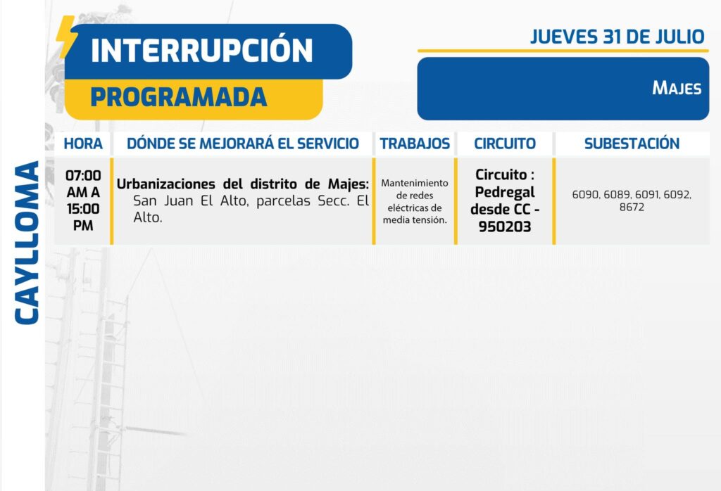 En Majes (Caylloma), el corte irá de 7:00 a. m. a 3:00 p. m. e impactará en las urbanizaciones de San Juan El Alto y parcelas de la sección El Alto. El motivo es el mantenimiento de redes eléctricas de media tensión. El corte corresponde al Circuito Pedregal desde CC – 950203 y afectará las subestaciones 6090, 6089, 6091, 6092 y 8672.
